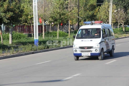 Yining, Xinjiang, China - 09-17-2011 A police minivan traveling down a road in Yining city in Xinjiang province in northern China.