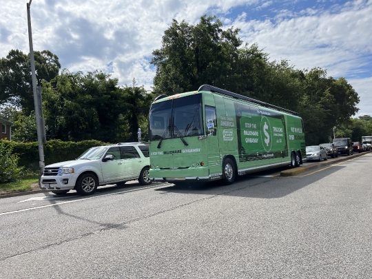 Hampton, VA, USA 08042025 A bus displays signage reading Stop the Billionaire Giveaway, referencing public accusations that President Donald Trump favored billionaire interests.