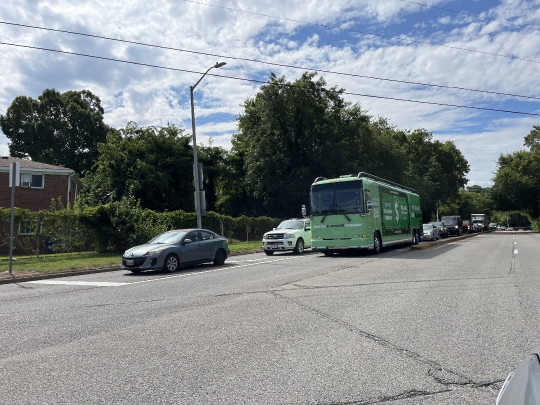 Hampton, VA, USA 08042025 A bus displays signage reading Stop the Billionaire Giveaway, referencing public accusations that President Donald Trump favored billionaire interests.