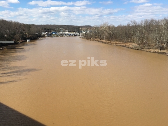 Woodbridge, VA, USA 02/27/2016- : Scenic view of a calm Potomac river flanked by verdant trees in the back_drop_. A marina is seen in the distance.