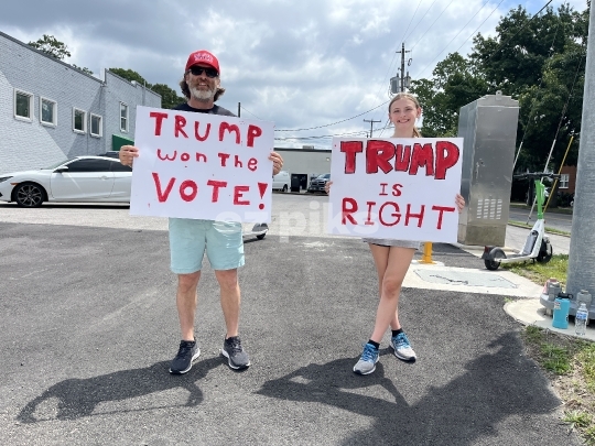 Norfolk, VA, USA - 06-14-2035 A man and an adolescent female raising placards that read Trump Won the Vote and Trump is Right respectively.