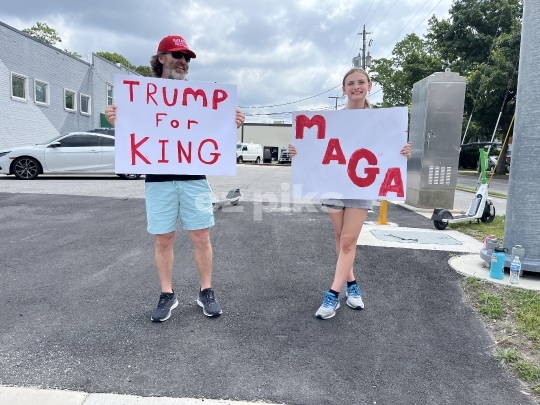 Norfolk, VA, USA - 06-14-2035 A man and an adolescent female raising placards that read Trump Won the Vote and Trump is Right respectively. Norfolk, VA, USA - 06-14-2035 A man and an adolescent female raising placards that read Trump for King and MAGA respectively.