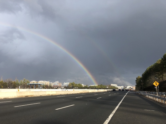 Reston, VA, USA - 02-21-2018 A rainbow appearing in sky after spring rainfall.