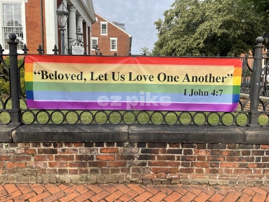 Fredericksburg, VA, USA - 10102022 A bible verse printed on a rainbow sign hanged on a fence of a building on Caroline Street in downtown Fredericksburg city in Virginia, USA.