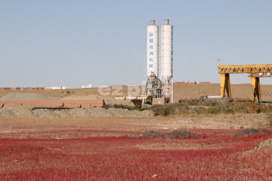 Xinjiang, China - 09/17/2011: Two silos are seen behind a spot of natural red sand landscape.