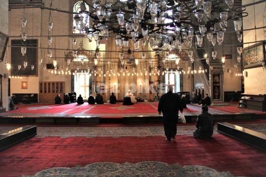 Istanbul, Turkey - 10/04/2020: A Muslim scholar lectures worshipers at Sultan Bayezid mosque in downtown Istanbul.