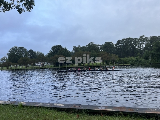 Chesapeake, VA, USA - 09-18-2024 A group of athletes exercising rowing crew in Atlantic intracoastal waterway.