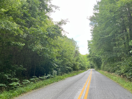 A paved rural road flanked by tall, vibrant green deciduous trees under an overcast sky.
