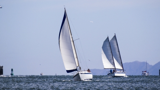 San Diego, CA, USA - 07-12-2014 Two white sailboats navigate choppy, dark blue water under a clear, light blue sky, with San Diego shore visible in the distance.