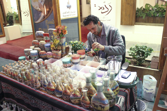 Doha, Qatar 12-29-2013 A sandart craftsman at Souq Waqif carefully fills a glass bottle with colored sand, creating customized desertthemed designs for visitors at the markets art center.