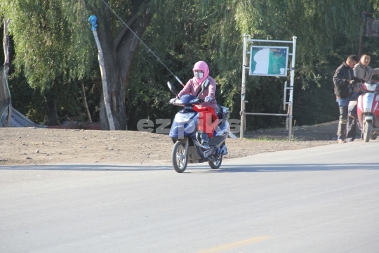 Yining, Xinjiang, China - 09-17-2011 A Chinese Muslim woman riding a scooter in Yining city in Xinjiang province in Northern China.