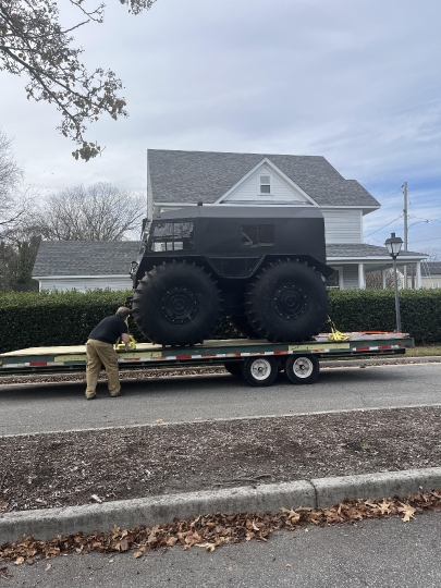 Norfolk, VA, USA - 12-04-2025 A man securing a SHERP vehicle loaded on a trailer. SHERP is a Ukrainian UTV designed for rough and soggy terrain.