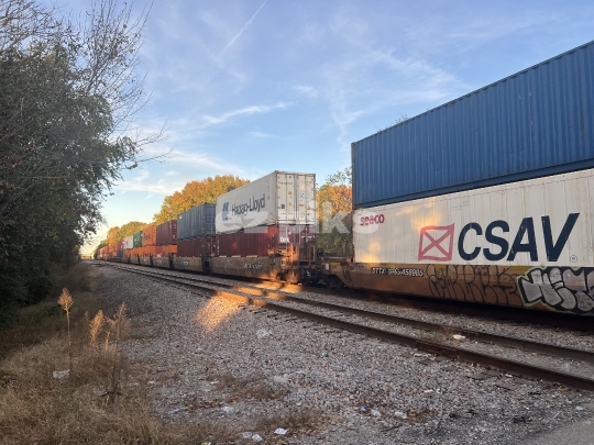 Portsmouth, VA, USA - 10-28-2024 Shipping containers belong to different companies loaded on a freight train.