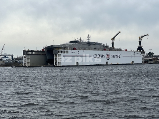 Norfolk, VA, USA - 02282024 A ship being maintained at a shipyard on Elizabeth River in southeast Virginia, USA.
