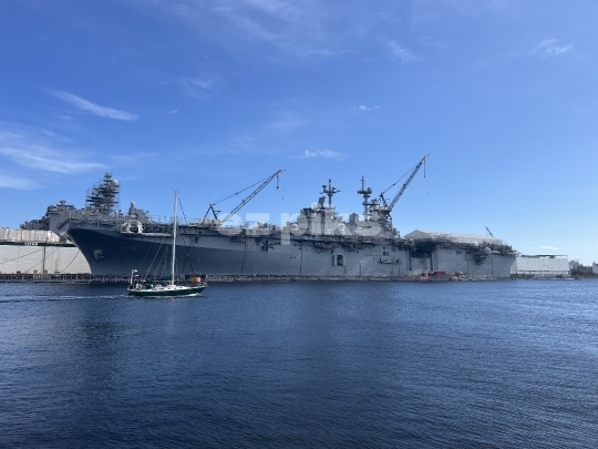 Norfolk, VA, USA - 11-01-2024 A leisure boat passes a US navy ship being maintained and services at Norfolk Naval Shipyard.