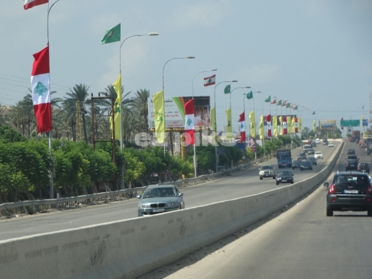 Sidon, Lebanon - 08092014 Hezbollah and Lebanese flags along a highway south of Beirut, Lebanon.