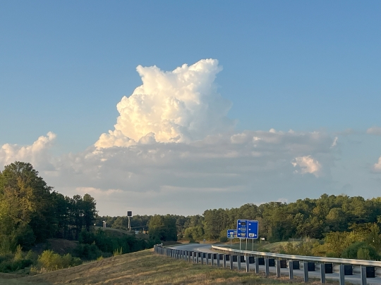 Front Royal, VA, USA - 10-26-2025 A towering cumulus cloud rises over a curving highway, its sunlit edges hinting at storm potential in the late-day sky.