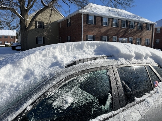 Norfolk, VA, USA - 02/21/2025: About 5 inches of snow on the top of a car in Norfolk City in southeast Virginia, USA.