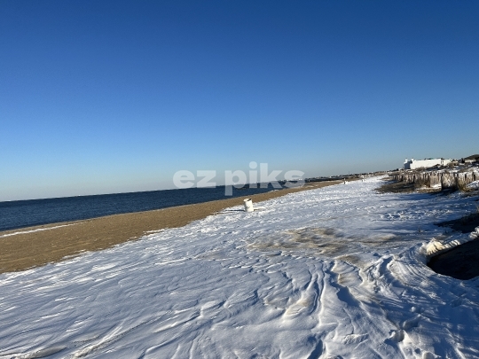 Norfolk, VA, USA- 02-21-2025 Snow is seen on the sandy beaches of the coastal city of Norfolk in southeast Virginia, USA.