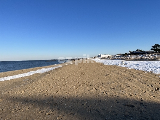 Norfolk, VA, USA- 02-21-2025 Snow is seen on the sandy beaches of the coastal city of Norfolk in southeast Virginia, USA.