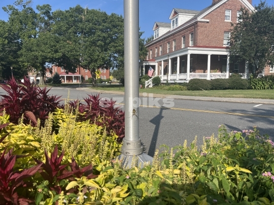 Hampton, VA, USA - 09-15-2024 A relatively large black spider with yellow dots on its back is seen with its web anchored on a plant in the median of a public street.