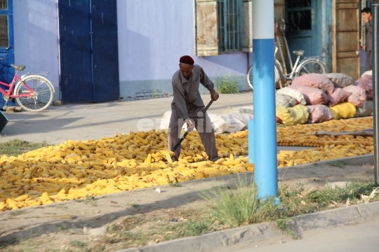 Turpan, Xinjiang, China- 09-17-2011 A man raking corn kernels spread out on the road for sun drying.