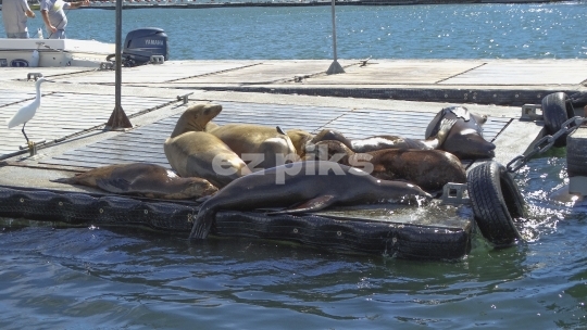San Diego, CA, USA July 12, 2014 Seals and an egret enjoy sun light on wooden walkway in a marina in San Diego, CA, USA.