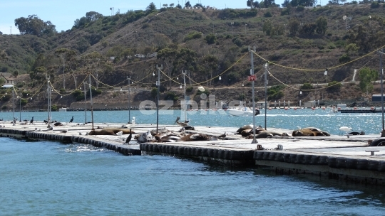 San Diego, CA, USA July 12, 2014 Seals and an egret enjoy sun light on wooden walkway in a marina in San Diego, CA, USA.