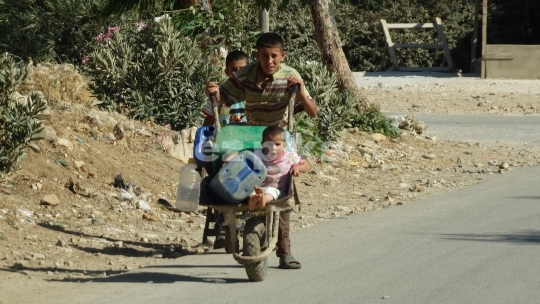 Barelias, Lebanon- 05-14-2014 An adolescent Syrian refugee pushes a child Syrian refugee in a rusty worn out wheelbarrow.