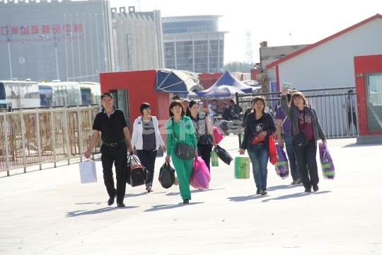 Xinjiang, China - 09182011 Travelers walk through a China-Kazakhstan border crossing.