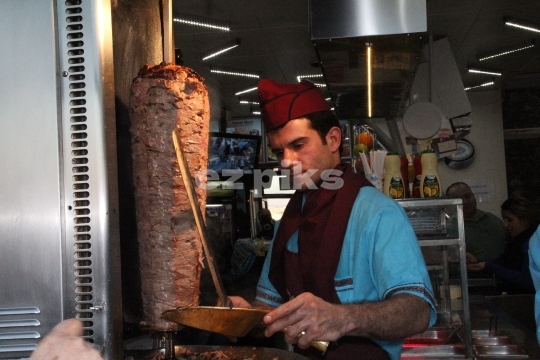 Istanbul, Turkey - December 29, 2011 A Turkish Shawirma chef cuts meat to serve to costumers, in Lalili traditional market.