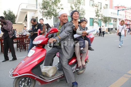 Xinjiang Province, China - 09/20/2011: Chinese Muslim Uighur family riding a red scooter.