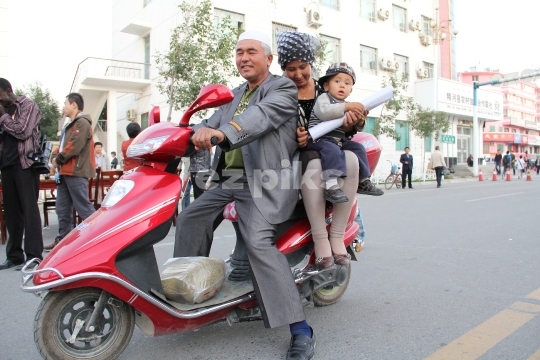 Xinjiang Province, China- 2011:09:20: Chinese Muslim Uighur family riding a red scooter.