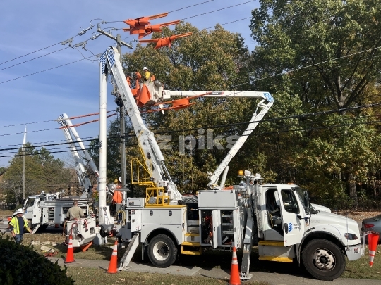 Newport News, VA, USA - 11-19-2024 Utility company workers performing regular maintenance on distribution lines and sub transmission lines.