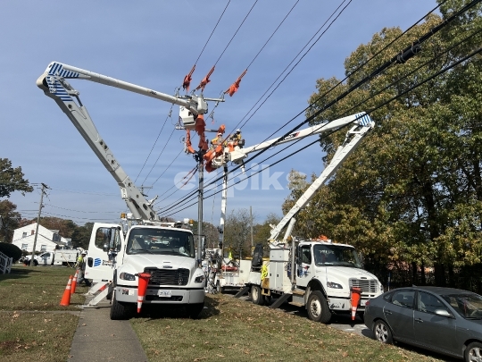 Newport News, VA, USA - 11-19-2024 Utility company workers performing regular maintenance on distribution lines and sub transmission lines.