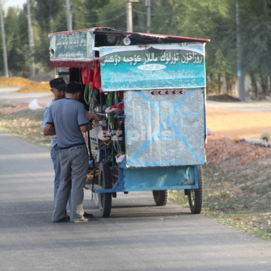 Yining, Xinjiang, China - 09-19-2011 A street vendor with a vending cart showing merchandise to a customer.
