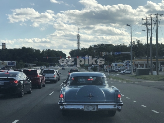Hampton, VA, USA - 09-07-2019 Rear view of a classic blue Lincoln Continental Mark II, stopped in traffic, featuring prominent chrome bumper and taillights. Continental was produced by the Continental Division of Ford Motor Company between 1956 and 1957.