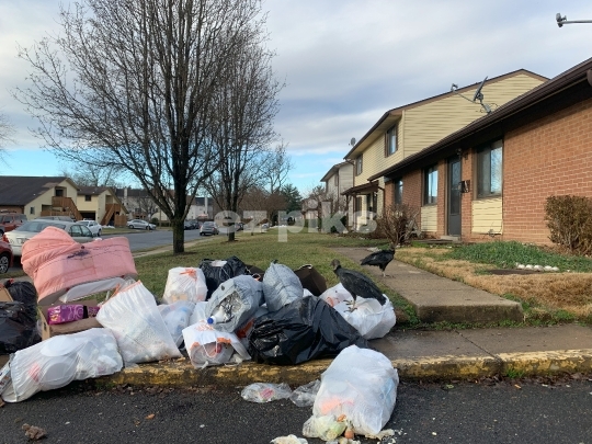 Alexandria, VA, USA- 01-13-2023 Vultures rummage through trash bags looking for food in a residential area.