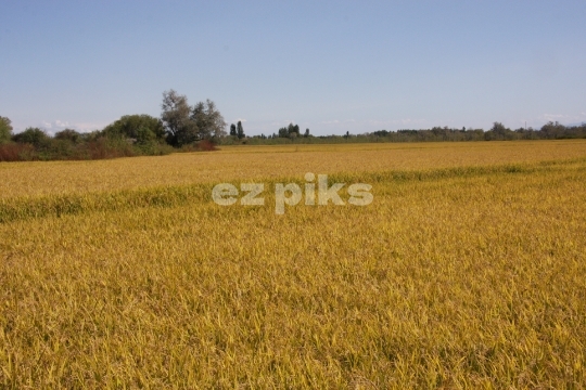 Xinjiang, China - September 18, 2011 Clouds covering mountains tops in the background of a vast wheat field in Xinjiang province in northeastern China.