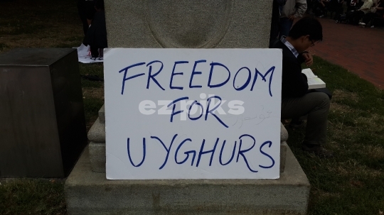 Washington, D.C, USA - September 25, 2015 A hand written banner demanding freedom for Uighurs the Chinese Muslims in front of the White House where protestors gathered to protest the visit of Chinese President Xi Jinping.