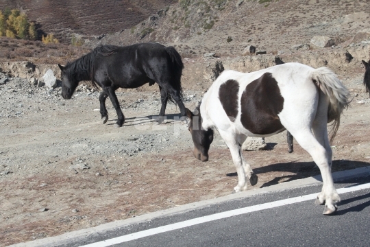 Wild horses crossing a road in Xinjiang Province in northern China.