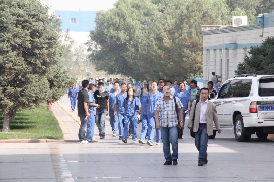 Urumqi, Xinjiang, China - 09-20-2011 Chinese workers leaving work at home time.