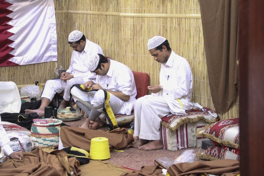 Doha, Qatar - December 29, 2013 - Workers weaving traditional Mens Arab dresses bisht.