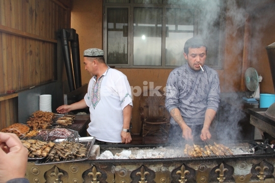 Xinjiang Province, China - 09/22/2011: Two Chinese Muslim Uighur men making and selling Shish kebab and other BBQed meat.