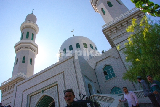 Xinjiang, China, 09/02/2021: Chinese Muslim Uighurs in front of a mosque. Uighurs are the largest minority ethnic group in China_qt_s north-western province of Xinjiang.