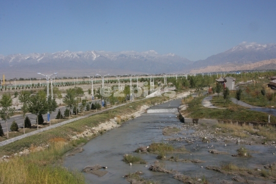 Xinjiang Province, China, 09/19/2011: River next to a road in Xinjiang province in northern China.