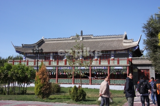 Xinjiang, China - 09/18/2011: A group of people in front of traditional Chinese building.